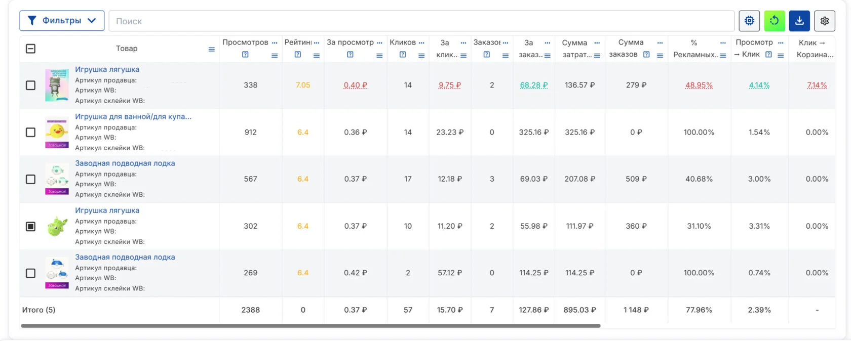 - отследить, как изменились показы, переходы и заказы по конкретным товарам;