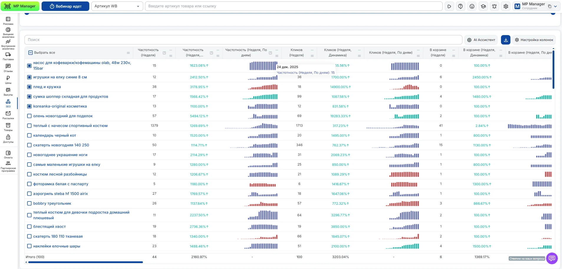 - Через Аналитику WB в MP Manager удобно мониторить динамику продаж и остатков по товарам, чтобы раньше видеть риск дефицит товара и не доводить до OOS.